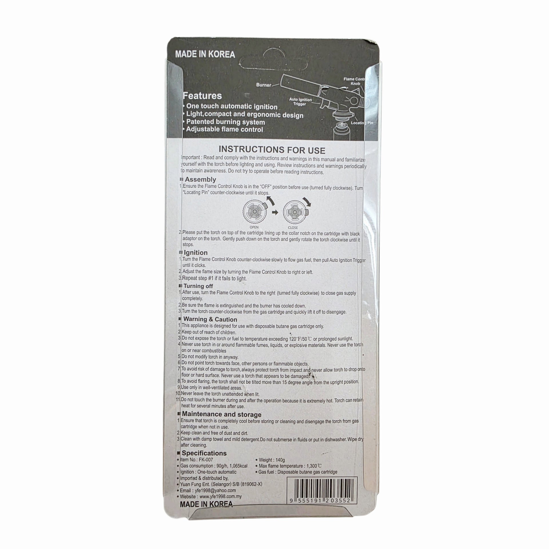 "Fireking" FK-007 Premium Handheld Butane Gas Torch - Auto-ignition - Made in Korea