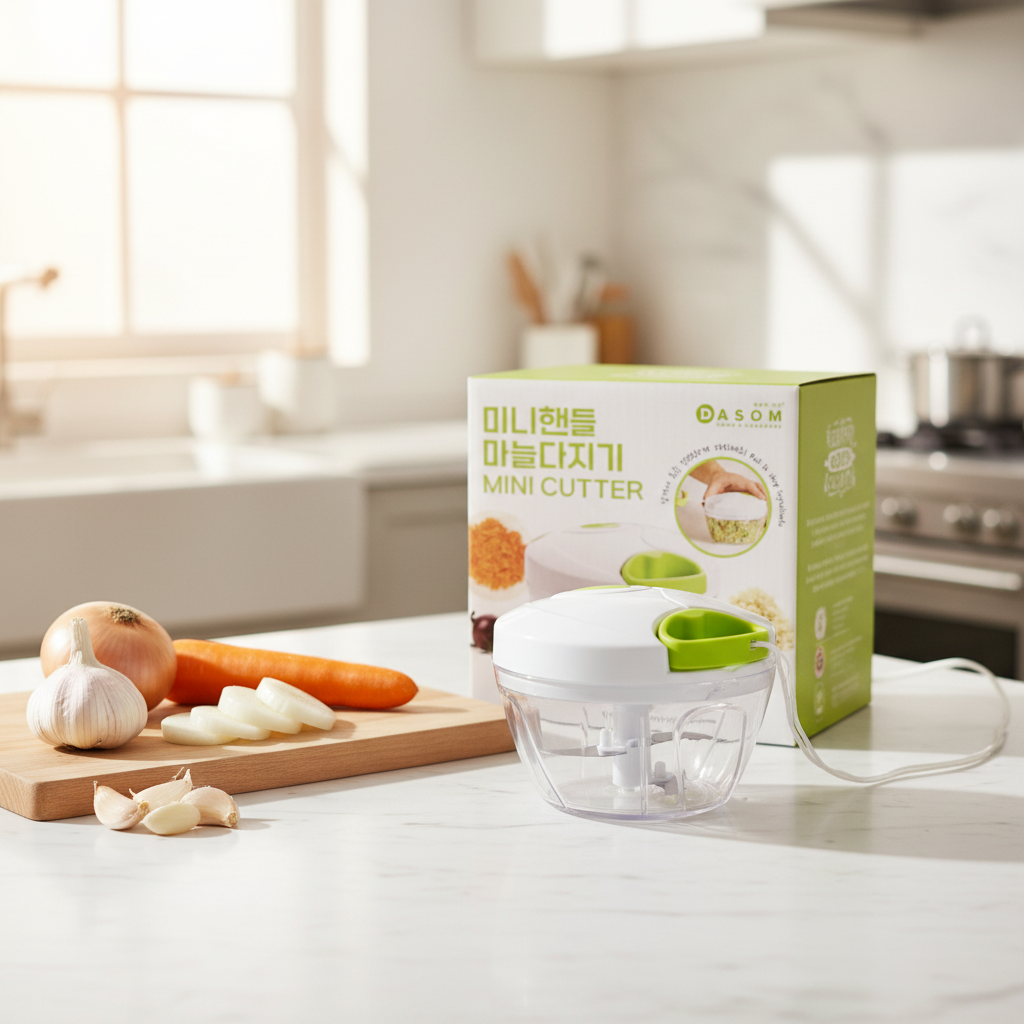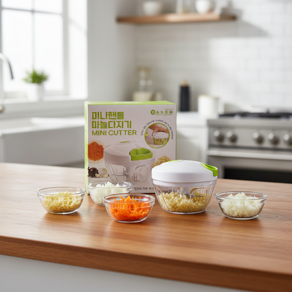 Introducing Dasom Home & Cookware's Mini Drawstring Chopper - the ultimate kitchen tool for effortless chopping. Its multiple stainless steel blades can chop a variety of ingredients like garlic, onions, fruits, herbs, salsas, meat, and other vegetables with ease. No electricity needed, just pull the handle and let the spinning blades do the work. Body is made of strong clear plastic, making it lightweight and durable, and the product is also easy to take apart for quick cleaning. Also features a non-slip ring on the base for added stability during use. Upgrade your cooking experience today!