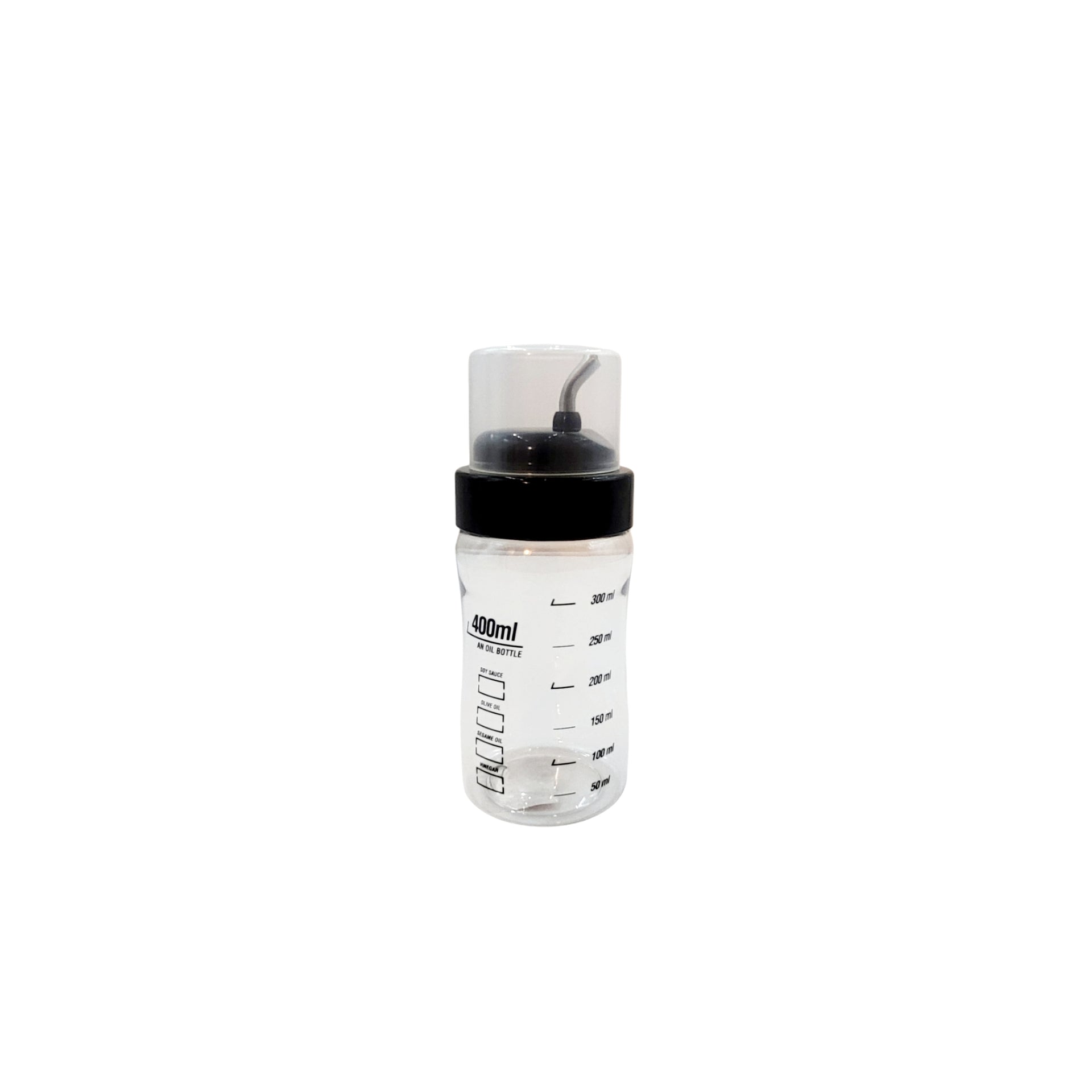 Introducing the Wide Body Oil/Vinegar/Sauce Bottle. This versatile bottle, made from high quality durable plastic, boasts a curved stainless steel spout for easy pouring. It also features measurement lines (50ml increments) for precise usage.