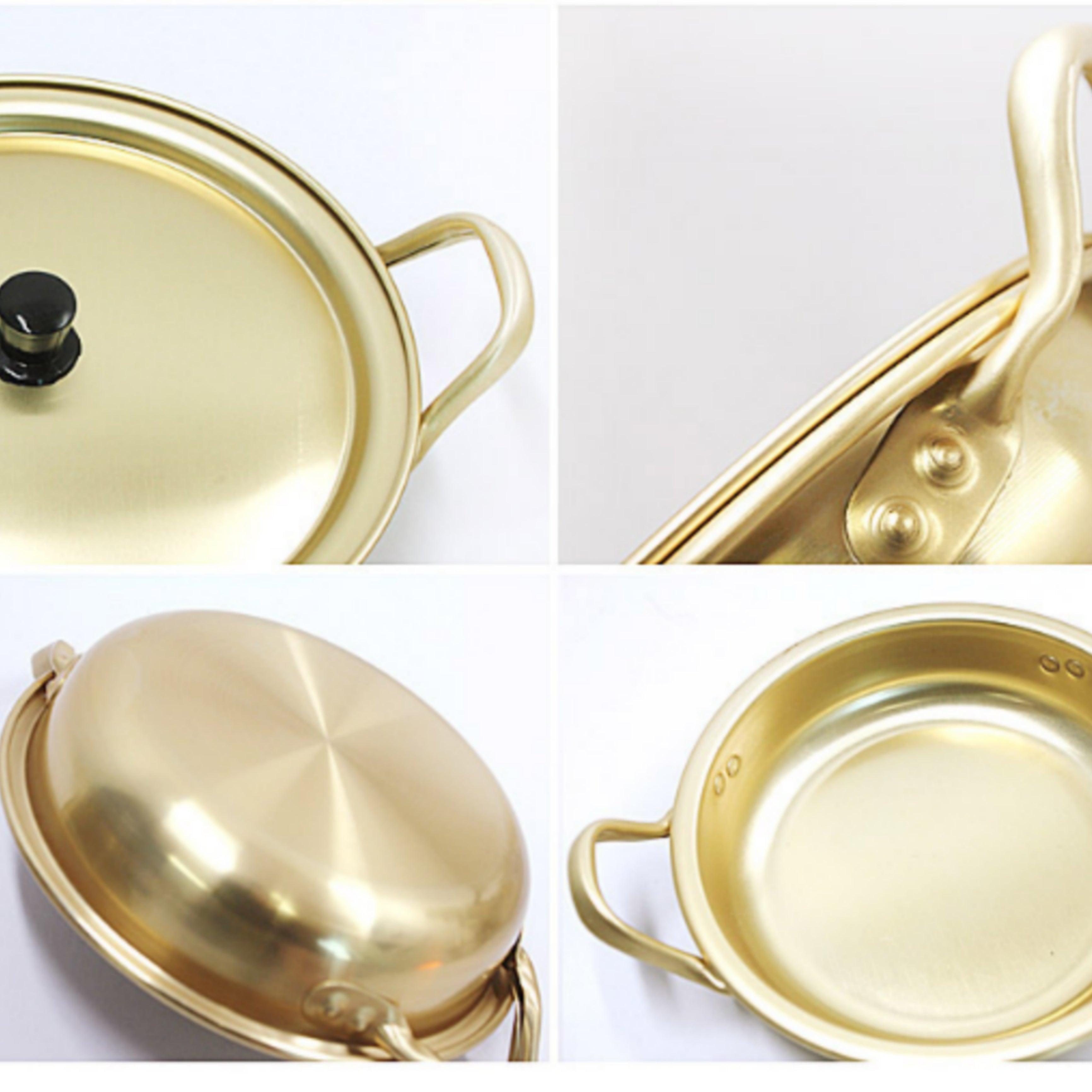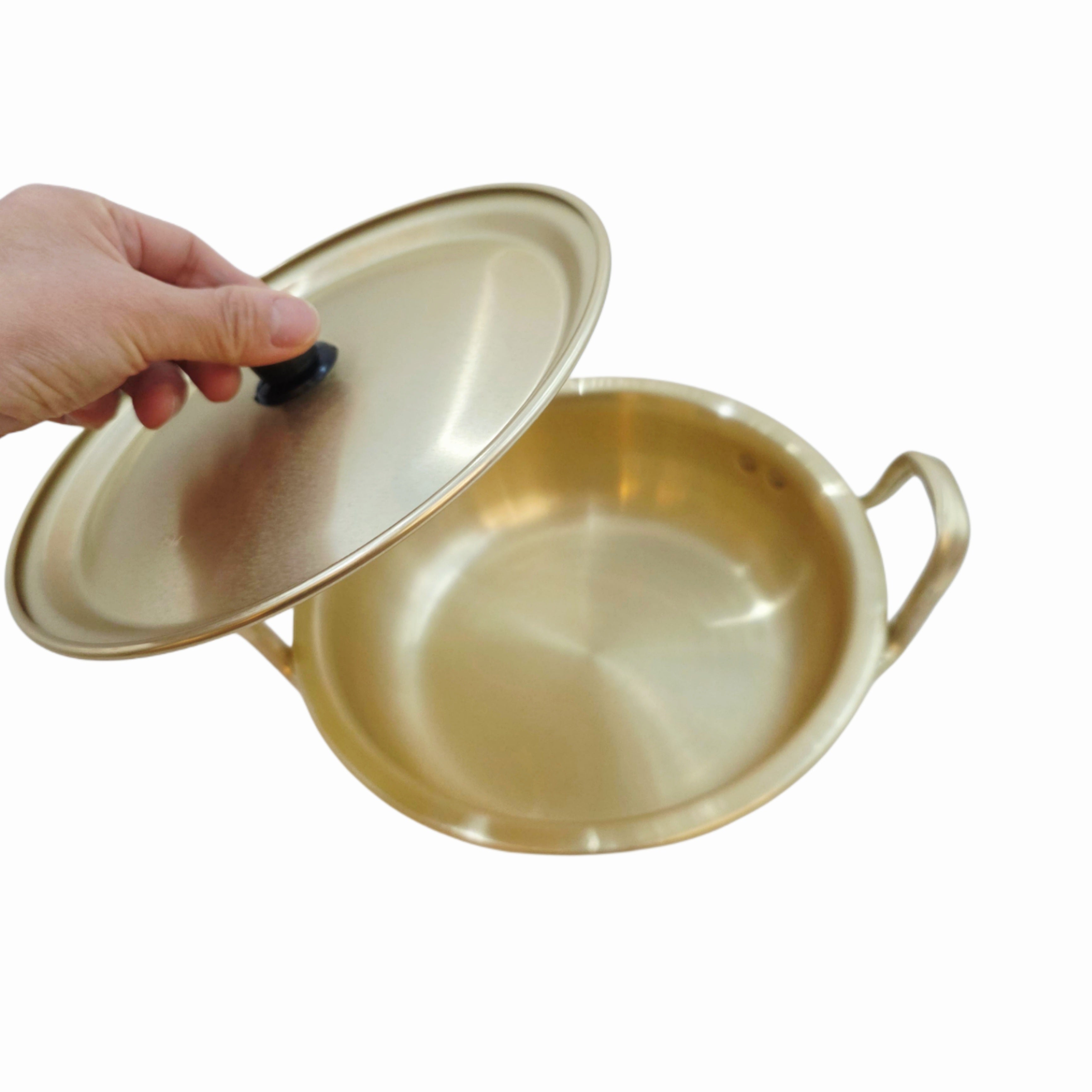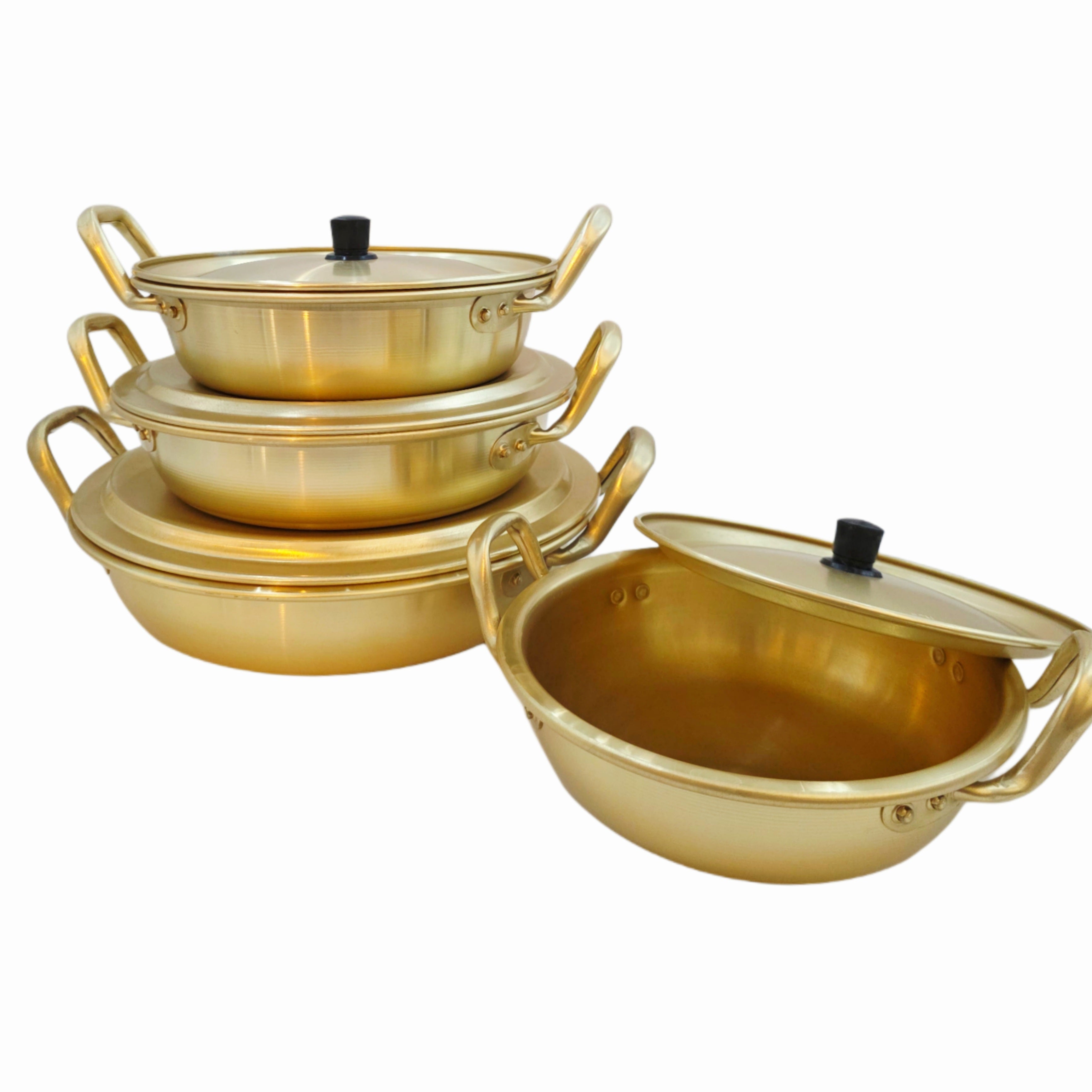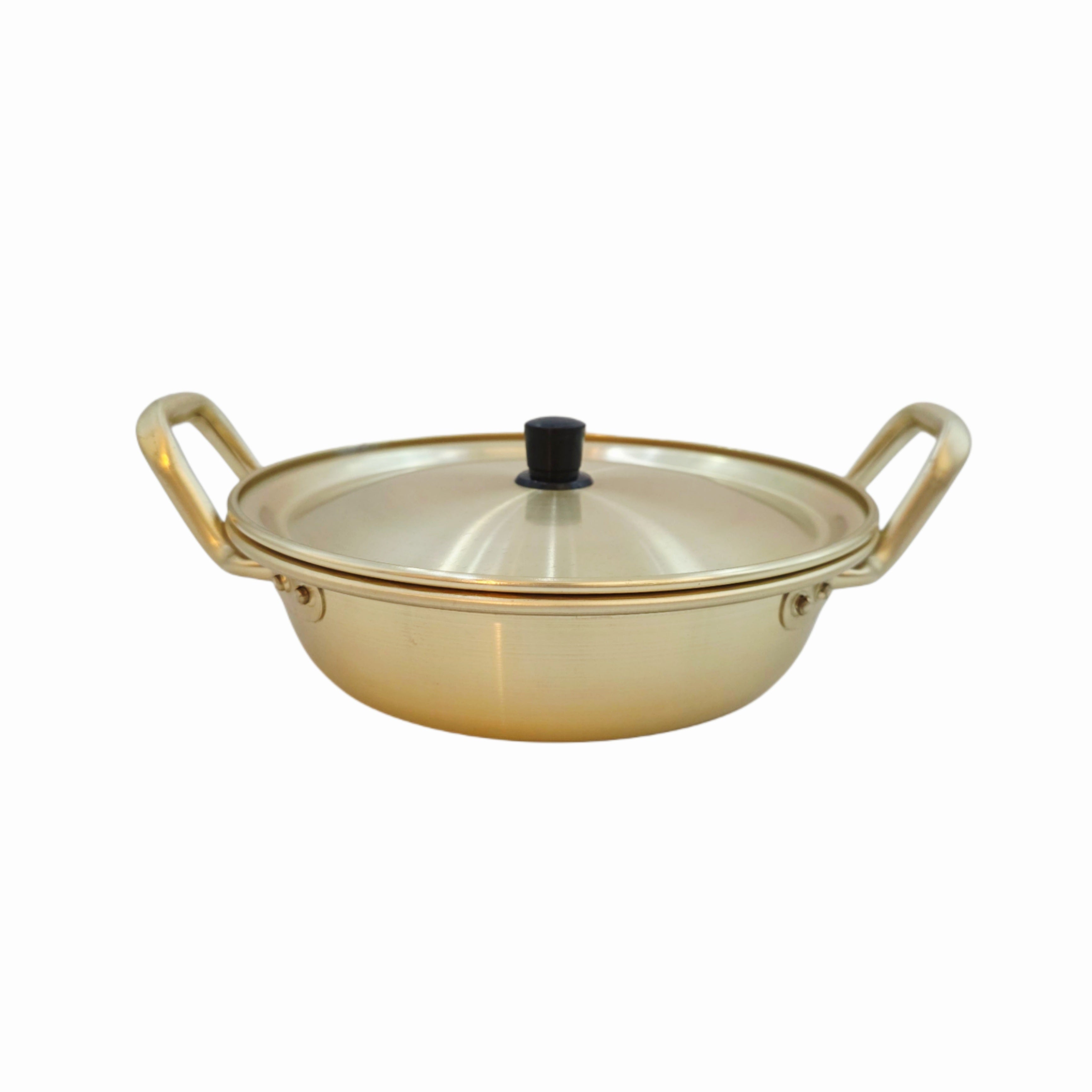 Made in Korea by the original Dolphin Brand, these gold-tone aluminum pots feature a wide, shallow design that allows for easier access to ingredients and better surface heating.