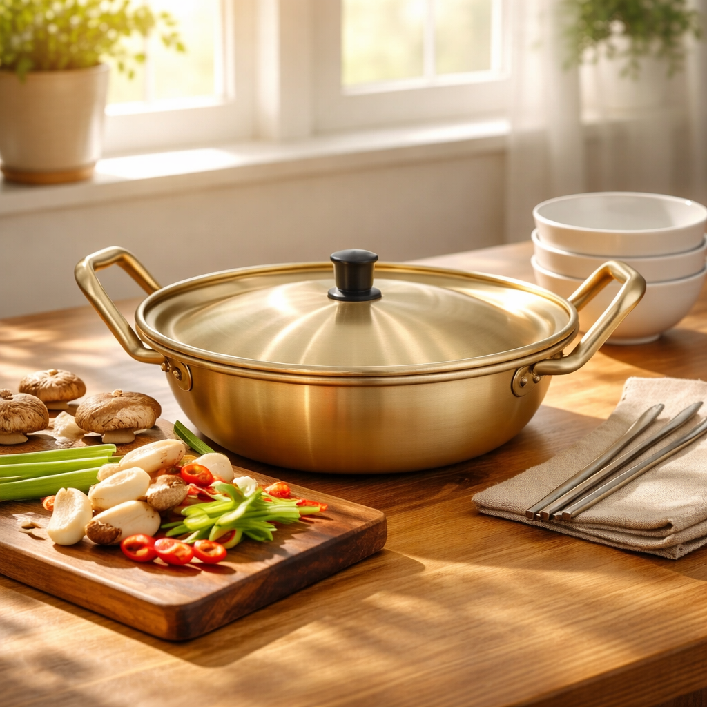 Low-profile Korean aluminum cookware designed for hot pot, shabu-shabu, and shared tabletop meals.