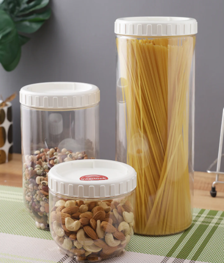 The clear see thru material allows for quickly identifying contents. Perfect for storing dry foods, spices, veggies, snacks, cereal...pretty much everything!