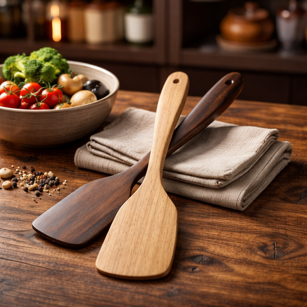 The smooth wood construction protects cookware from scratches while providing a balanced, sturdy feel in hand.